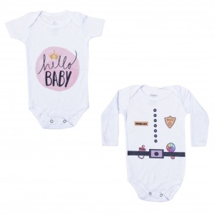Produzido em tecido 100% poliéster e na cor branca, o body baby é confortável e gostoso para o uso do bebê.