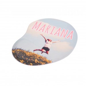 Este mouse pad personalizável possui descanso em formato ergonômico, apoio em gel, base com espuma e revestimento em poliéster.